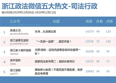 本期司法行政榜,前三依次是“浙江监狱”“金华监狱”“浙江省十里坪监狱”。热文榜榜首则是来自黑马“良渚之光”的《未来,从浙里出发》,该文展示了浙江省良渚强制隔离戒毒所二大队在未成年戒毒人员特色教育方面的好做法。