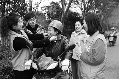 近日,德清县雷甸镇镇雷甸村兰姐工作室开展“佩戴头盔 安全出行”交通劝导活动。图为村里妇联主席徐云兰和平安志愿者们为路人配戴头盔。通讯员 杨飞