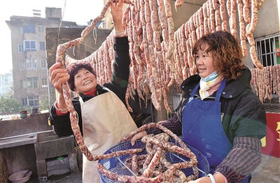 12月22日,在金华市婺城区江南街道下官桥农贸市场,经营户们忙着为市民翻晒过年香肠。冬至过后,“金华香肠”迎来生产和销售高峰,经营户们利用传统工艺加紧进行灌装、风干、包装,及时满足市场需求,浓浓的年味扑面而来。孔德宾 摄