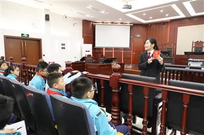| 12月4日,仙居法院组织开展“国家宪法日”公众开放日活动,邀请仙居县第一小学的50余名师生参观法庭、法律知识竞答、模拟法庭等活动。图为法官为学生们讲解宪法和民法典小知识。 |