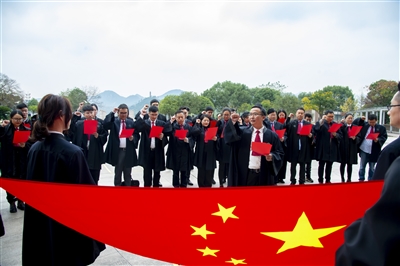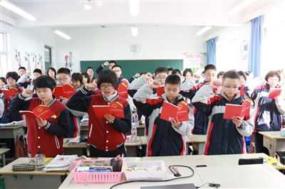 | 黄岩澄江中学积极开展“学习宪法 运用宪法”主题班会活动。班会上,学校组织各班举行宪法宣誓仪式,开展“宪法晨读”和宪法知识竞赛等活动。老师们还借助视频、图片等形式向同学们普及法律知识。图为学生们在宪法宣誓仪式上郑重宣誓。 |