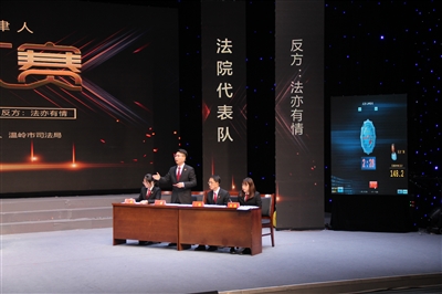 | 12月4日,温岭市开展了“衣食住行”法律知识闯关、首届法律人电视辩论大赛等形式多样的宣传活动。图为辩论大赛现场,法院代表队和律师代表队就“法不容情”与“法亦有情”为题展开辩论。 |