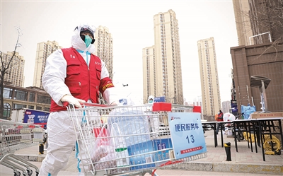 1月6日,在沈阳市皇姑区中风险地区——中海寰宇天下天悦园区,工作人员在大门前为小区居民传递生活物资。