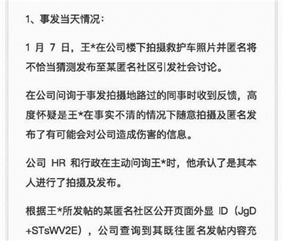 针对拼多多员工匿名发帖被辞退一事,11日,拼多多回应,解约源自发现该员工在匿名社区发布极端言论。拼多多根据王*所发帖的某匿名社区公开页面外显ID(JgD+STsWV2E),公司查询到其既往匿名发帖内容充斥不良“极端言论”,诸如:“想要××死”,“把××的骨灰扬了”等。公司人力资源部研判该员工上述言论严重违反员工手册,且有可能其极端情绪会对其他同事造成不可知威胁,决定与其解除劳动合同。据悉,1月7日,王*在公司楼下拍摄救护车照片并匿名将不恰当猜测发布至某匿名社区引发社会讨论。