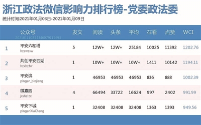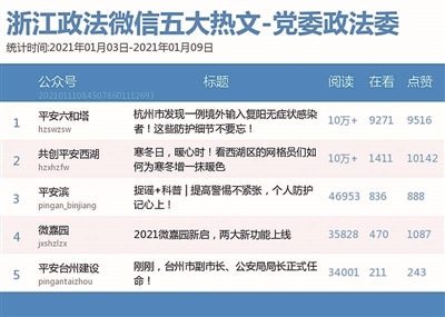 本期政法委榜,“平安六和塔”继续保持2020年的强势劲头,夺得“双料”冠军,其发布的《“杭州市发现一例境外输入复阳无症状感染者!这些防护细节不要忘!》一文获得“10万+”阅读量,跻身热文榜第一。