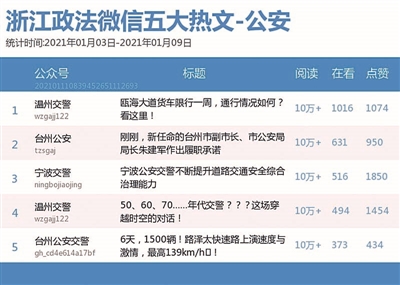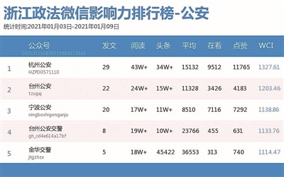 本期公安榜, “杭州公安”“台州公安”“宁波公安”拿下影响力榜前三。热文榜上阅读量“10万+”好文频出,“温州交警”的《瓯海大道货车限行一周,通行情况如何?看这里!》成为黑马,跃居榜首。