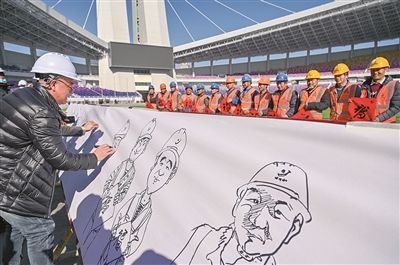1月13日,杭州黄龙体育中心改造项目现场,浙江一建集团的建筑工人们收到了省诗词与楹联学会的书法家们创作的福字和春联。省漫画家协会的会员们还现场为工人们绘制漫画,邀请他们留在浙江过个好年。