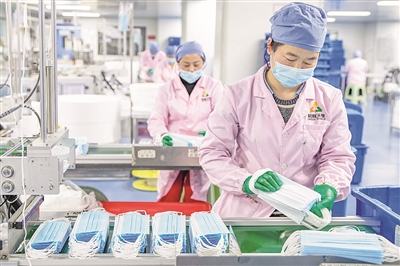 1月26日,长兴一家无纺布制品公司的全自动口罩生产机不停运转,保障疫情防控需求和市场供应。同时,企业为减少人员流动,鼓励全体员工就地过年,一起打好今年春节“防疫战”。目前企业一次性医用防护口罩日生产量100万片。王晋焱 吴拯 摄