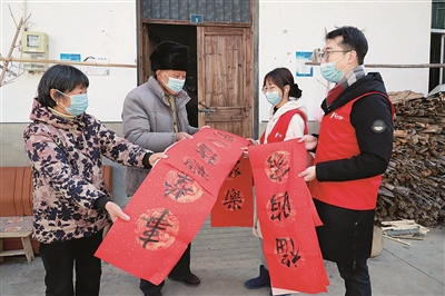 日前,开化农商银行与县书法家协会联合举办的“迎春送福进万家”活动在音坑乡儒山村进行,书法家们现场挥毫泼墨写春联,并把一幅幅春联和福字上门送到农户家。