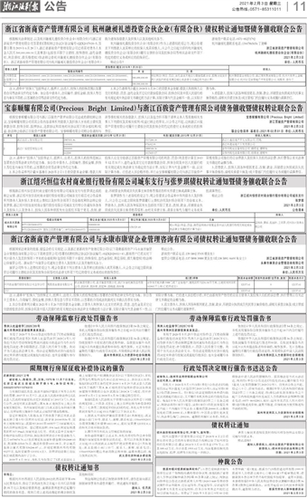 宝泰顺耀有限公司(Precious Bright Limited)与浙江百骏资产管理有限公司债务催收暨债权转让联合公告