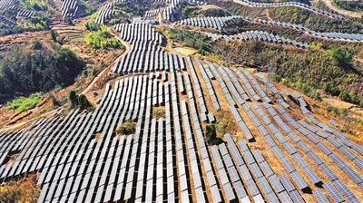 2月19日,鸟瞰仙居县上张乡四岙湾村贫瘠山上,一排排蓝色的光伏面板在阳光的照耀下熠熠生辉。该乡通过流转荒山引进发展光伏产业,既为村集体带来了山地租金收入,又为村民提供了劳务就业,帮助山区农民增收。