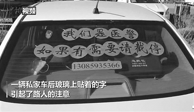 近日,在甘肃省庆阳市西峰区海绵运动公园停车场,一私家车后贴着的“我们是医警,如果有需要请截停”引起关注。据悉,车主赵小燕是名警察,其丈夫是医生,儿子是消防员。因而这个医警家庭在自己的私家车上贴有“需要请截停”的字样,车上还自费备有救急医药包,以帮助有需要的人。