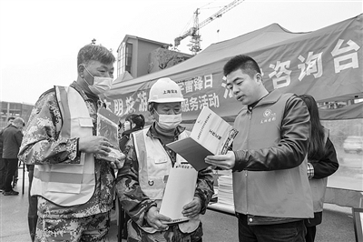 3月2日,太湖龙之梦乐园项目工地内,青年志愿者们正在为返浙复工的外来务工人员提供法务咨询、健康义诊等服务。