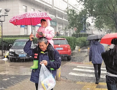 | 一名老人带着孩子冒雪出行。 刘卫兵 摄 |