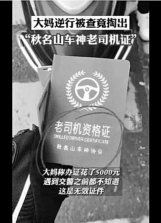 近日,广西贺州一位大妈骑电动车多次逆行。被警方拦截后,大妈掏出了一本由“秋名山车神协会”认证的老司机资格证。面对交警询问,大妈先是说花5000块办得此证,后又说不清楚证的来历,在遇到交警之前,她并不知道这本证是无效证件。