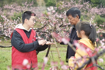 近日,部分大学生回到家乡诸暨,用所学专业知识与当地青年志愿者一起开展助农活动,为父老乡亲提供帮助。图为安徽农业大学植物保护学院大三学生吴科寰向次坞镇农民讲解桃胶的经济价值。