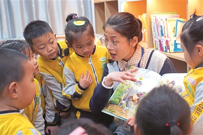 4月1日,幼儿园老师给孩子们讲述绘本上的红色故事。