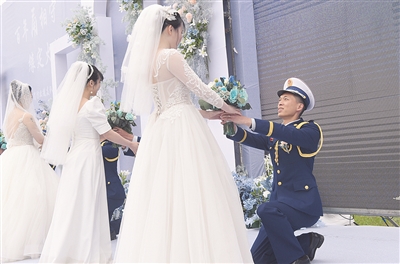 “老婆,我们来啦!”接亲团激动地喊道。经过“甬守初心”“心心相印”等游戏项目的重重考验,新郎们终于“抱得美人归”,接到了新娘。参加完庄严的升国旗仪式后,12对新人在队友团“向幸福出发”的欢呼声中,乘坐大巴车到达婚礼现场。