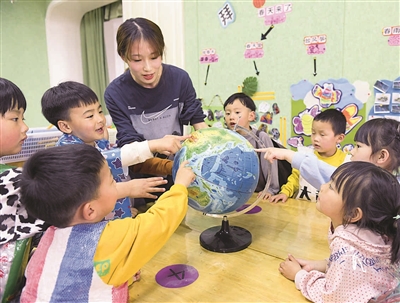 4月22日,老师带着孩子们认识地球上大海和陆地的分布。当日是世界地球日,湖州市吴兴区埭溪镇中心幼儿园开展了一场创意环保时装秀,向孩子们宣传绿色环保理念,增强热爱地球、保护环境的意识。