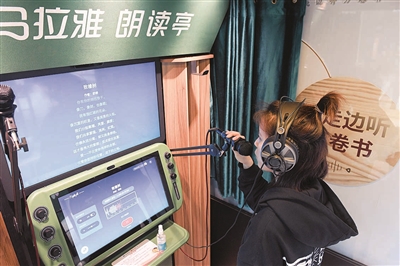 4月22日,顾客在书店朗读亭内选取内容进行录制,将音频分享给朋友。