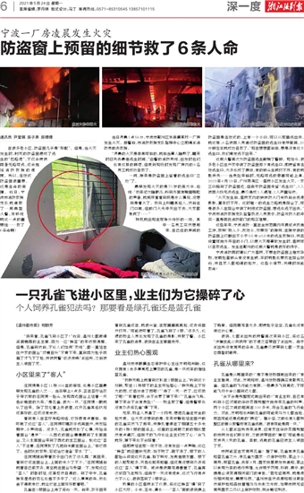 汪阿姨是小区11栋304室的保姆,也是小区里最早发现孔雀的人之一。当日早上6点多,正在客厅给孩子穿衣服的汪阿姨一抬头,发现西边窗台上站着一只色彩艳丽的大鸟。“是孔雀,很大一只。”汪阿姨一眼就认了出来。除了羽毛看上去很湿,这只孔雀其他状况还蛮好的,应该没有受伤。