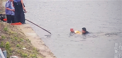 只听“扑通”一声,大家循声看去,原来俞建洪带上救生圈,也一个猛子扎进河中,朝着老杨的方向游去。周围的群众十分焦急,纷纷劝说老杨:“你快上来啊,不要再这样了!”
