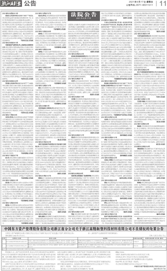 中国东方资产管理股份有限公司浙江省分公司关于浙江高精新型科技材料有限公司不良债权的处置公告