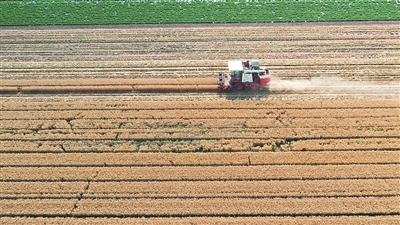 6月21日,河北唐山遵化市东新庄镇东梁子河村的农民驾驶农机在田间收割小麦(无人机照片)。