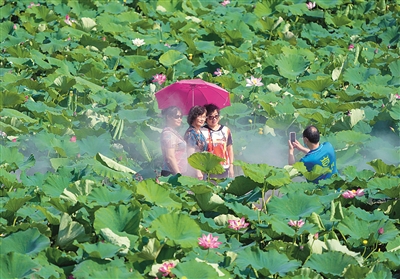 7月3日,游客在济南章丘区白云湖街道苏码村的千亩荷塘内游玩。