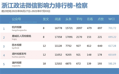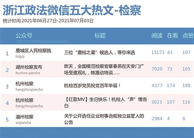 本期检察院榜,“鹿城区人民检察院”进步较大,排名第二。热文榜榜首是来自该公号的《三位“鹿检之星”候选人,等你来选》,文章展示了三位检察官的优秀事迹。