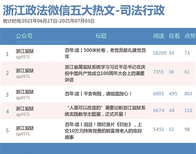 位于本期司法行政榜榜首的为“浙江监狱”,该公众号推出的文章包揽了热文榜前三,均为党建题材,分别是《百年颂|500米长卷,老党员献礼建党百年》《浙江省属监狱系统学习习近平总书记在庆祝中国共产党成立100周年大会上的重要讲话》《百年颂|平安有我,请祖国放心!》。