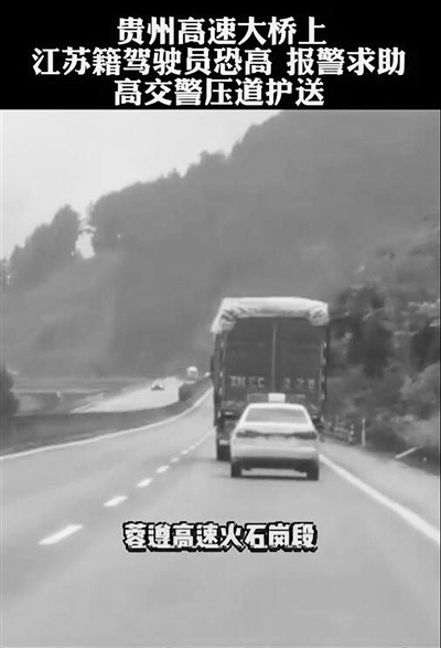 近日,在贵州蓉遵高速路上,一江苏籍货车司机由于恐高不敢过火石岗五岔大桥,于是报警求助。最终高速交警为其压道护送离开。