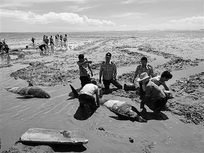 本报讯 7月6日上午,12头瓜头鲸在临海的头门港海域搁浅,当地公安、港航渔业、消防救援等部门和热心群众先后赶到现场开展救援。