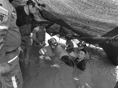 记者赶到现场时,救援人员正在滩涂上忙碌。记者看见,一顶顶临时用木棍和遮阳布支起的遮阳棚里,救援人员已挖出了多个大水坑,多头瓜头鲸在水坑里扭动着身躯,身上盖着湿毛巾等物品,救援人员不停地向瓜头鲸身体上倒水,“这是为了降温保护”。