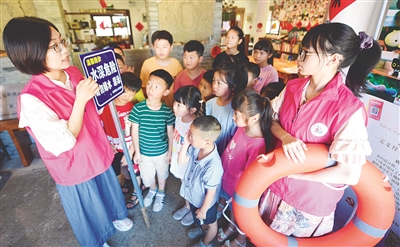 7月8日,台州市路桥区新桥镇近20名职工子女,认真听志愿者阿姨讲解防溺水安全知识。当日,该镇总工会、妇联主办的“关爱职工、暖心至夏”爱心暑托班在金良社区开课,为职工孩子免费提供课本辅导、游戏活动、趣味课堂、安全知识等暑期课程,解决职工的后顾之忧。