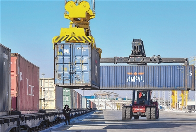 在内蒙古乌兰察布市集宁区郊外,不计其数的彩色集装箱整齐地排列在开阔的货运场上,静待安检装运。不远处,满载着货物的列车在铁路线上缓缓前行,仿佛一支“钢铁驼队”,信心满满地踏上“一带一路”征程。