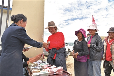 | 7月17日,四川壤塘县瑟谷村农牧民在领取务工收入。 新华社 李鑫 摄 |