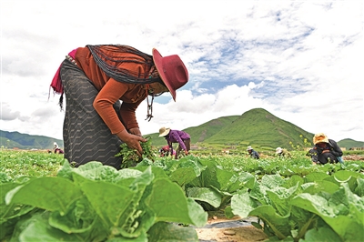 | 7月17日,四川壤塘县瑟谷村农牧民在蔬菜基地的菜地内除草。 新华社 李鑫 摄 |