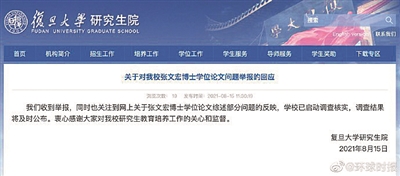 8月15日,复旦大学研究生院在其官网发布“关于对我校张文宏博士学位论文问题举报的回应”,称:我们收到举报,同时也关注到网上关于张文宏博士学位论文综述部分问题的反映,学校已启动调查核实,调查结果将及时公布。衷心感谢大家对我校研究生教育培养工作的关心和监督。