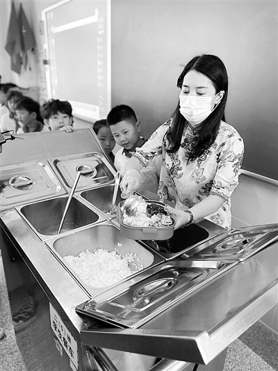 | 澎汇小学的老师给孩子们分发饭菜 |