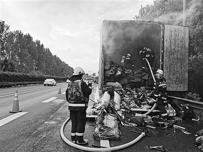 现场,驾驶员为了避免车头起火,采取了自救措施,将车头与车身分离开。消防员到场后,一边喷水冷却车厢,一边慢慢打开车厢后门,顿时一股浓烟从车厢内涌出。