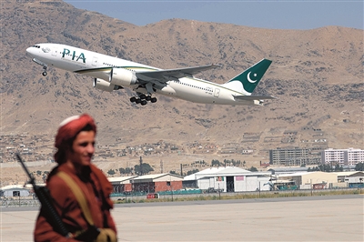 9月13日,在阿富汗喀布尔国际机场,塔利班成员在巴基斯坦国际航空公司一架客机旁执勤。