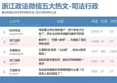 司法行政榜上,“浙江监狱”再次夺魁,“杭州司法”紧随其后,其热文《母亲要让养女继承遗产,四个亲生子女急了,养女主动放弃唤醒沉睡多年的亲情》聚焦亲情,通过讲述父母与子女间的冷暖故事,一举拿下热文榜第一。