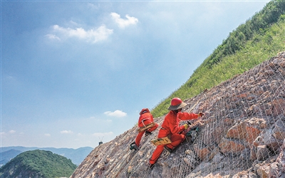 9月22日,位于长兴县煤山镇的千井湾矿区,工人们在岩壁边给矿山边坡铺设钢丝网,作绿化修复前的准备。目前,该矿区已实现复绿6万平方米。近年来,长兴县坚持“绿水青山就是金山银山”理念,积极开展废弃矿山和在生产矿山的退矿复垦和生态修复。