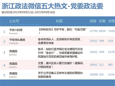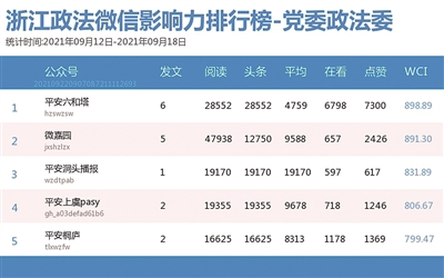 本期党委政法委榜单,前三名依次为“平安六和塔”“微嘉园”“平安洞头播报”。热文榜首是来自“平安六和塔”的《【仲秋初月】守护平安,我们“可盐可甜”!》。这篇推文展示了中秋佳节身边政法干警守护平安的风采,既接地气又温馨感人,获广泛关注。