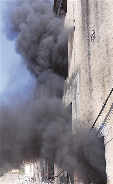 随后,现场火势开始蔓延。约5分钟后,现场堆放的物料引燃了停在一旁的一辆电动自行车,火势进一步扩大,滚滚浓烟开始从1楼入口和2楼窗户向外翻滚,先后传出“啪啪”两声电动自行车车轮炸裂的声音。