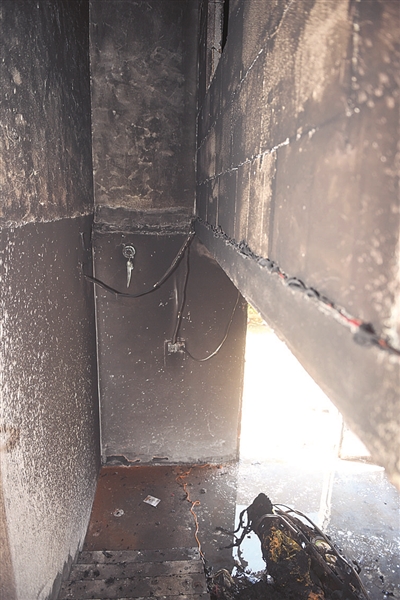待现场浓烟散去,火灾现场可见,防火门后的房间明显比阁楼处受损小很多,体感温度也是阁楼内部要高很多,布置在阁楼内部墙上的电气线路的熔化状态也最厉害。