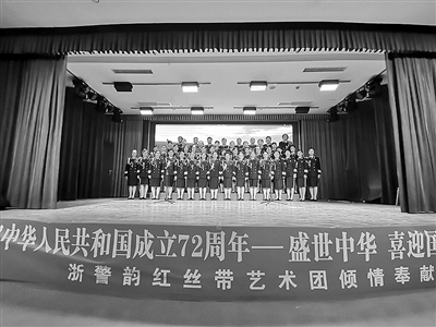 本报讯 9月25日下午,杭州市余杭区五常社区文化家园,大合唱《我和我的祖国》拉开了浙警韵红丝带艺术团第15场公益演出的序幕。雄壮的大合唱之后,女声独唱《我和我的祖国》清亮动人、音诗画《红色十月》多彩多姿……赢得阵阵掌声。