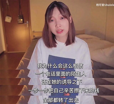 近日,B站音乐区UP主@杨可爱Ukulele发布的一条视频引起网友讨论。她带着哭腔自述了她所遭受的一起电信诈骗事件,她在骗子的诱导下转给了对方16万元。过程中,她一次又一次忽视了国家反诈App发出的提醒,慢慢走入圈套。9月21日,杨可爱在接受记者采访时说,以前看到被电信诈骗,她也觉得是一件很离谱的事情,“可是当事情真正发生到我头上时,我才后悔莫及!整个诈骗手段并不高级,但我还是被牵着鼻子走了……希望大家在看到我的经历后,引以为戒。”