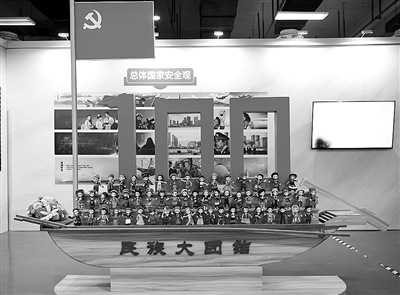 “守护平安”展馆内,一件泥塑作品特别引人瞩目:党旗高挂在船头、红色鲜艳的“100”大字矗立船身、56个身着各少数民族服饰的人儿站立船沿,这件名为《民族大团结》的作品,由浙江省第一监狱“黏土修心坊”的13名罪犯历时半年完成。